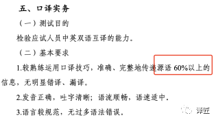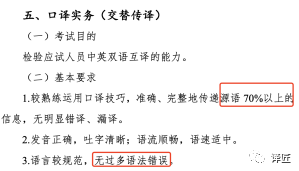 4. 考生现场表现:以口译考生为例,除译出率之外,声音、语气、表达,心理素质等也会影响到整体表现和评分,尤其是二级口译,三级、二级大纲(2020年版本)截图如下,二级大纲译出率要求为70%,比三级高出10%。如何评分、10%到底差在哪里,大部分考生是不清楚的。