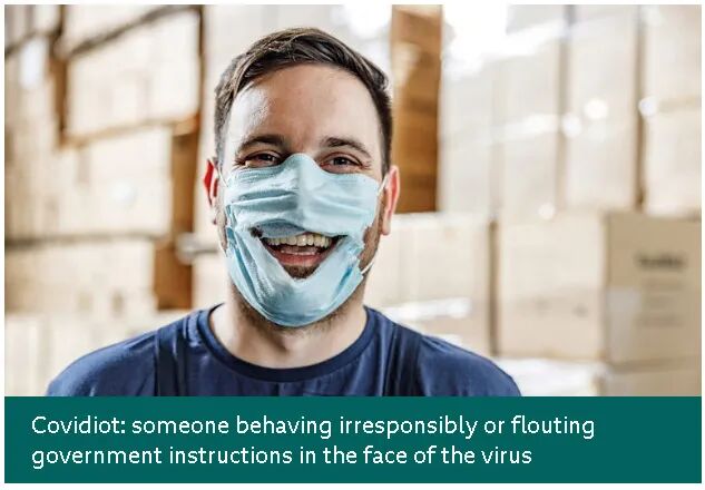 Covidiot: someone who is behaving irresponsibly or flouting government instructions in the face of the virus