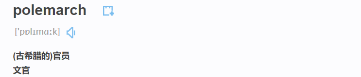 polemarch这个单词的正确拆分是polem+arch。希腊词根polem-表示war,比如polemic [pəˈlemɪk] n. 争论,辩论文章;辩论者;辩论术。希腊词根arch表示主要的、最初的和管理者,如archbishop [ˌɑːtʃˈbɪʃəp] n. 大主教;总教主;archaeology n.考古学和monarch [ˈmɒnək] n. 君主,帝王;最高统治者,希腊词根mon-表示only,alone,one。所以polemarch的字面意思是“war leader”,那当然就是官员了。