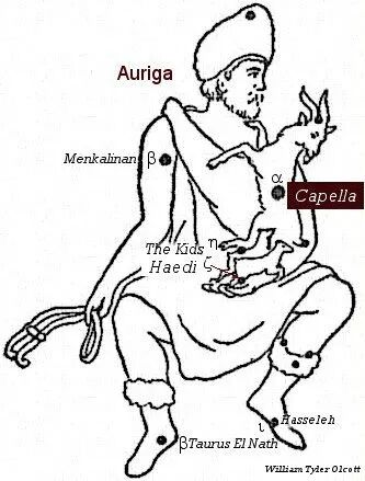 为啥汉语释义是“五车二”呢?因为Capella这星星呀非常亮,不仅希腊罗马人能看到,中国古人同样能看到。中国古代星象知识中,认为这个星星联同周围的星星的样子象五辆战车,而这个Capella位于其中的第二辆车,所以叫了“五车二”,搞笑,但有厘头。