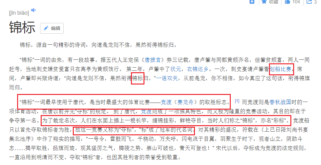 中文的“锦标”啥意思?百度百科是这样介绍的。按照我摩西较真的态度,凡涉及我不确定的词源,我要去查查确认,但全中文的,就当是正确的,所以这个“锦标”还当真和ship船(赛龙舟)有关了哈。