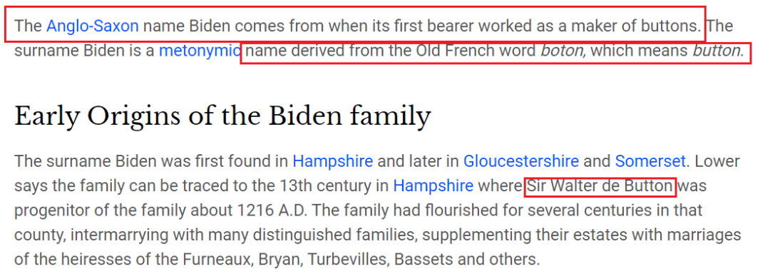 原来呀,英语姓氏Biden最早能查到的的祖先是Sir Walter de Button,而这个姓氏Biden其实就是单词button纽扣。