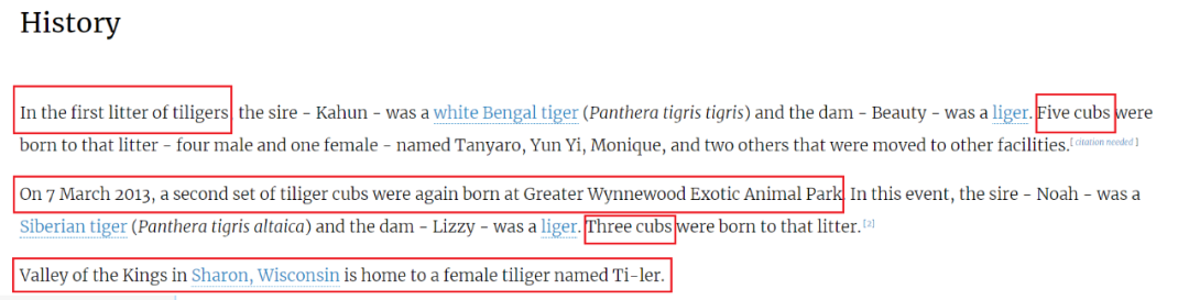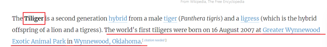 也就是说,在“荆荆”之前还不止一次,美国俄克拉荷马州的这家公园内已经前后出生过两窝共八只tiliger虎狮虎兽了,并且有名有姓还有性别。不止这个,最后一句话的意思是,威斯康星州的山谷中还有一只叫Ti-ler的雌性虎狮虎!!!这就尴尬了,加上“荆荆”这个小家伙在内,这总共有10只“虎狮虎”了,你要说“荆荆”是“世界唯一”,那是不是说美国那九只同类目前都已经死了?