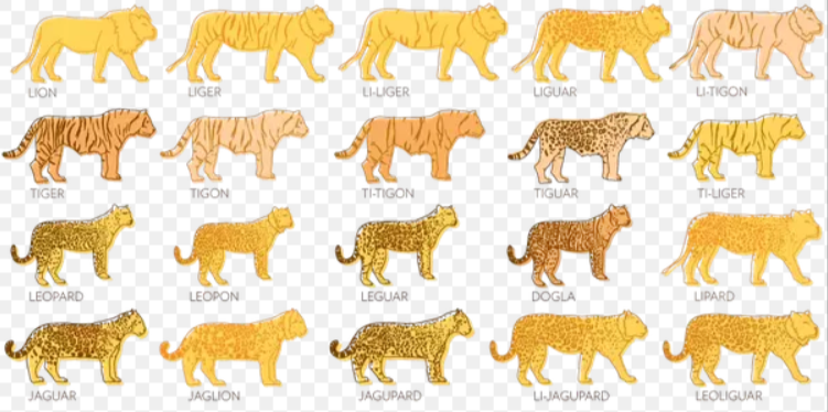 然而,无论是liger狮虎兽或tigon虎狮兽,都得分公母吧,遗传科学上,公的liger和tigon不具有生育能力,而母的liger和tigon具有生育能力。所以连续剧就有第二集了,即雌性liger或tigon与雄性tiger或lion交配后产生的后代有几种并且分别叫什么呢?二二得四,理论上是四种情况。