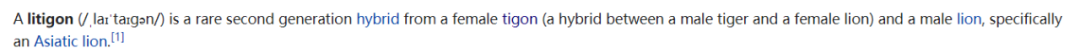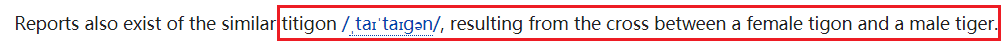 4.雄性老虎与雌性狮虎兽产下的后代叫虎狮虎,单词是,嗯,理论上应该叫tiliger,因为这是来自tiger和liger的混合,但对不起,包括wiktionary和wikipedia以及有道词典和金山词霸等等渠道在内,找不到这个单词的义项,更别说单词的音标了!!!