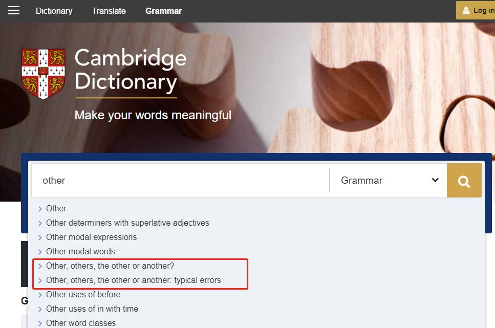 举个例子,other/the other/others/another 这几个词很多人经常搞混,它们之间有哪些区别呢?你可以直接在网站上搜索上面这几个单词的任意一个,从搜索结果下拉框中可以看到对应语法词条的入口。