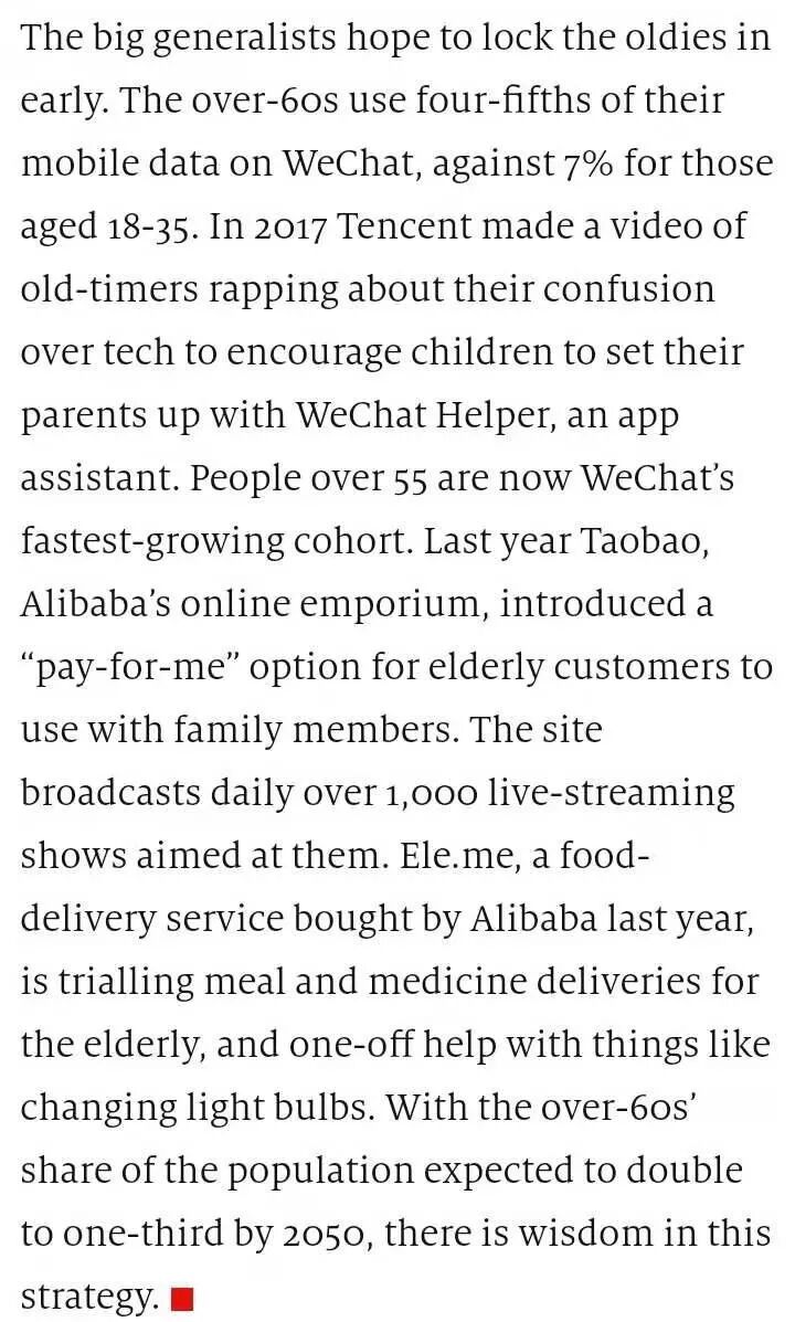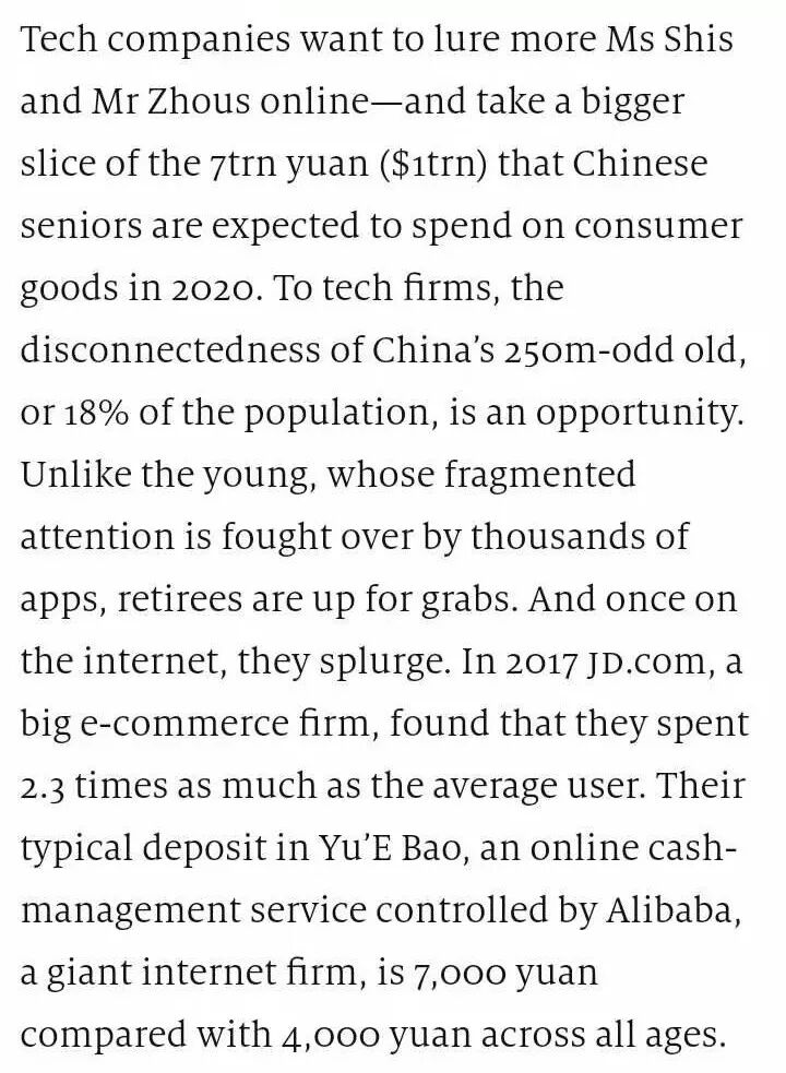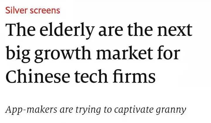 最近一期The Economist的商业版块有一篇讲中国老年群体智能手机使用的文章Silver screens,其中谈到目前中老年群体的智能手机渗透率仍然不高,但这一群体消费能力很强,因此众多互联网公司纷纷开始布局这一市场。
