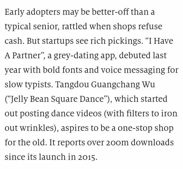 "I Have A Partner", a grey-dating app, debuted last year with bold fonts and voice messaging for slow typists. Tangdou Guangchang Wu (“Jelly Bean Square Dance”), which started out posting dance videos (with filters to iron out wrinkles), aspires to be a one-stop shop for the old.