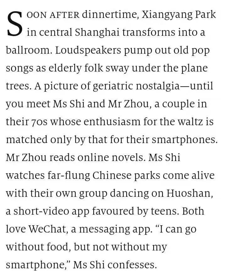 A picture of geriatric nostalgia—until you meet Ms Shi and Mr Zhou, a couple in their 70s whose enthusiasm for the waltz is matched only by that for their smartphones.