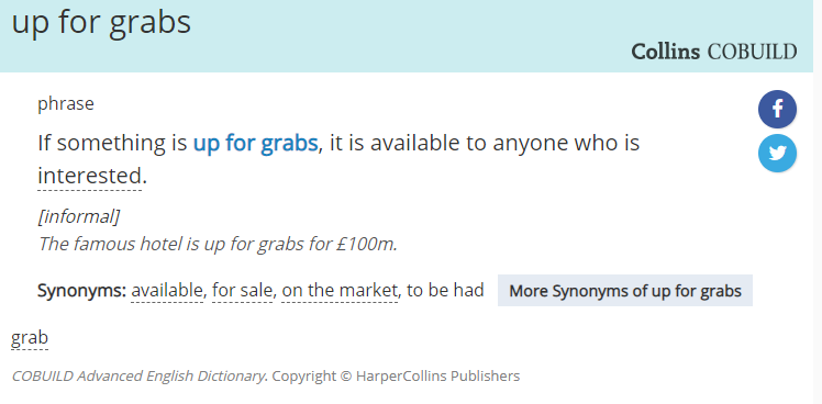 up for grabs是一个固定表达,意思是“(工作、奖金、机会等)人人都可以争取,供大家争取”。