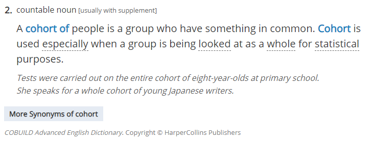 Cohort也是图表类文章中经常出现的一个表达,意思是“有共同特点(通常指年龄)的一群人”(a group of people who share a common feature or aspect of behaviour),它可以用来代替group这一说法。