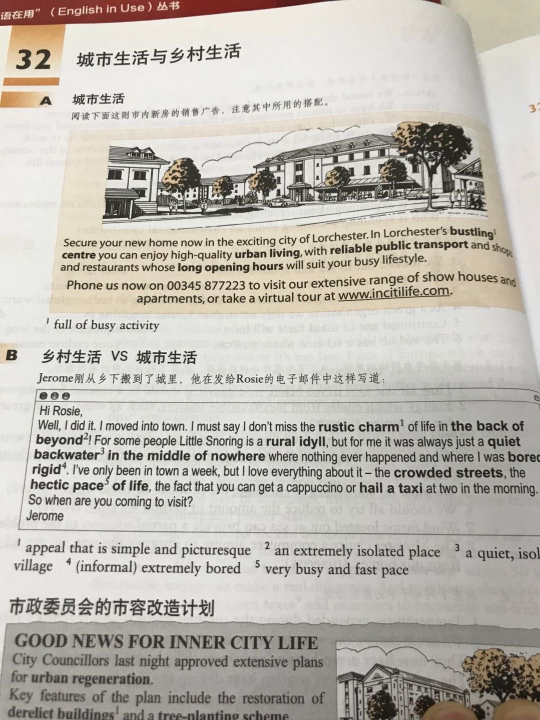 这种编排方式的另一个好处是我们能学到大量与主题相关的语料。很多同学在写话题作文时总是感觉无话可说,其中一个原因是平时没有积累与该话题相关的表达。《剑桥英语惯用搭配》里面提供的语料包括英国报纸广告、日常邮件、生活对话和报刊文章等,通过学习这些材料我们可以扩大自己的主题语料库。比如在“城市生活与乡村生活”这一小节中有这样的段落: