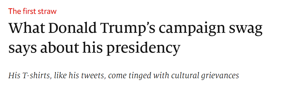the first straw来自我们熟悉的短语the last straw(最后一根稻草),同时straw在这里还是双关语:川普的竞选物资包括一种印有竞选标语的吸管(吸管的英文也是straw),the first straw隐含的意思是“这些竞选物资预示着川普失败的开始”。