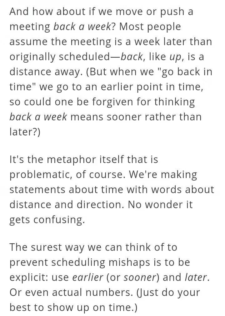 文章讨论的正是我们需要的信息。作者提到英语中的两个副词up/back与时间搭配时容易产生歧义,比如"move a meeting up an hour"这一说法有两种理解。当我们从垂直方向看时间轴时,越往下则时间越晚,因此"move a meeting up an hour" 意味着“将会议提前一个小时”。