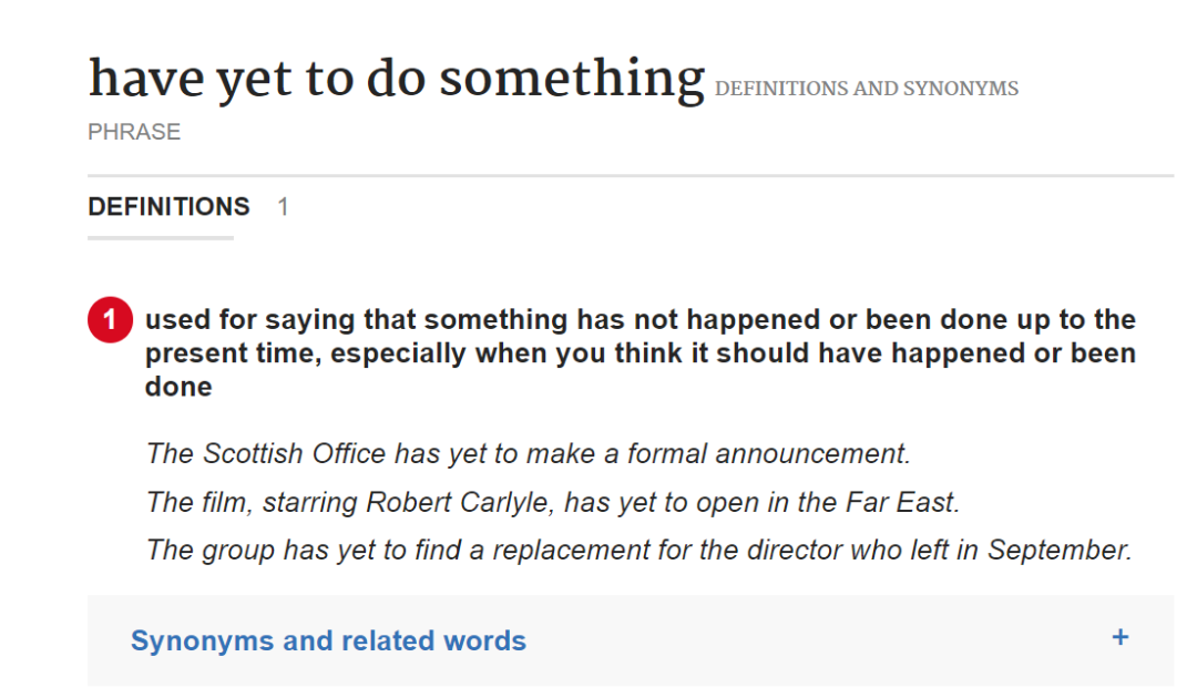 提问者把 yet 单独拎出来,在词典里面查了很久也没找到合理的解释。这里可以扩大查词单位,把 yet 前面的 have, to 都连在一起理解,词典中查找have yet to, 看看能否找到相关的词条。在麦克米伦词典中可以找到这样的解释: