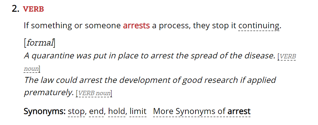 Arrest在这里如果理解为“逮捕”显然不符合文意,查看词典中arrest的词条我们会发现它还有另外一个含义“阻止,抑制”(to stop the progress or movement of something)。