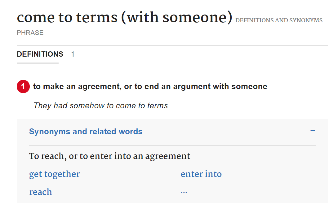 有部分同学可能不理解 bangbang men are coming to terms with modern technology 这句话的意思,这里 terms 不能单独拆开,而是要和前后的单词连在一起理解,即 come to terms with,在词典中可以找到对应的释义: