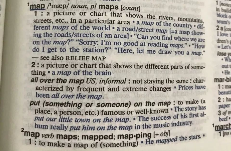 市面上常见的学习型词典收词范围会有差别,有些词组和搭配在某些词典上可能查不到,出现这种情况时可以多换几本词典试试看。举个例子,类似all over the map以及from coast to coast这样的美式短语目前只能在《韦氏高阶英语词典》上查到,如果你用的是《朗文词典》或者《牛津词典》,可能会找不到满意的解释。