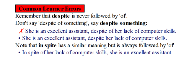 要减少上面提到的这些介词问题,最简单的方法是平时多做总结,多查词典。对于介词使用任何有模棱两可的地方都要去翻翻词典,看看解释和例句。举个例子,上面关于despite的用法,剑桥词典就给出了非常清楚的说明: