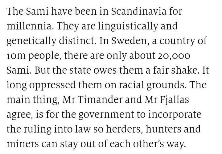 The Sami have been in Scandinavia for millennia. They are linguistically and genetically distinct. In Sweden, a country of 10m people, there are only about 20,000 Sami. But the state owes them a fair shake. It long oppressed them on racial grounds.
