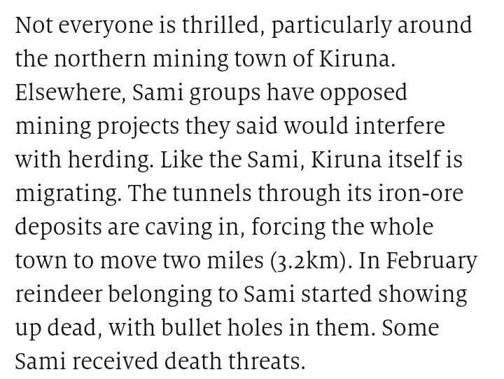 Like the Sami, Kiruna itself is migrating. The tunnels through its iron-ore deposits are caving in, forcing the whole town to move two miles (3.2km).