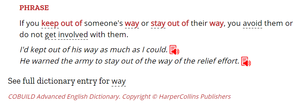 Stay out of somebody’s way是一个固定搭配,意思是“避开某人”。