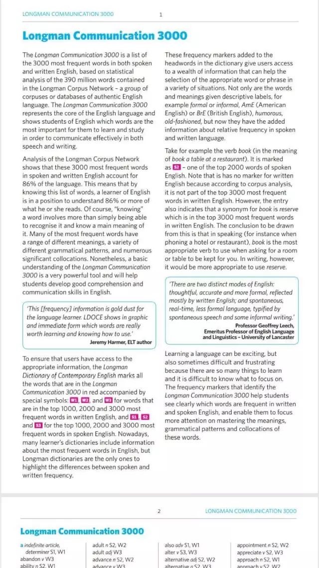 既然词典有这么多好处,那应该怎样“读词典”才科学呢?直接拿一本词典从头读到尾显然不现实,更好的方法是读词典中常用词的词条。对于这些常用词的范围,各大学习型词典其实都已经帮我们划分好了。例如朗文词典根据语料库统计结果给出了口语和写作中最常见的3000词(获取该词表可以向公众号回复“朗文3000”)。这部分词汇在朗文词典中都有特殊标记: