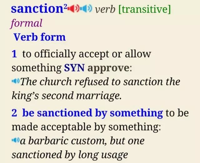 英语词典例句是一个宝库,通过读这些例句我们可以明确单词的搭配以及使用场景。举个例子,sanction 这个单词既可以表示“制裁,惩罚”,又可以表示“正式许可,批准,接受”,怎样理解这看起来很矛盾的一对解释呢?查一查英英词典,读读其中的例句吧。