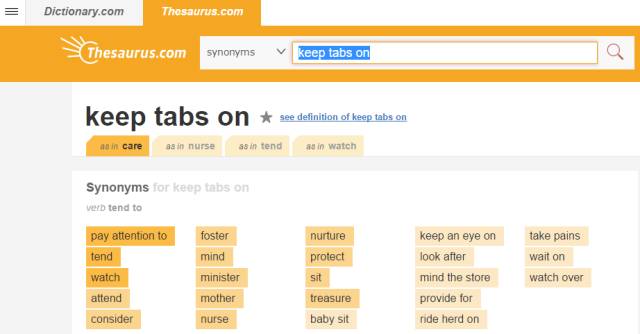 网站不仅针对单词查询,它还可以用来查询词组的同义和反义表达。对于词组 keep tabs on(密切注意……的动态),我们可以在上面找到 pay attention to, keep an eye on, ride herd on 等同义词组。这些在写作替换时都可以派上用场。