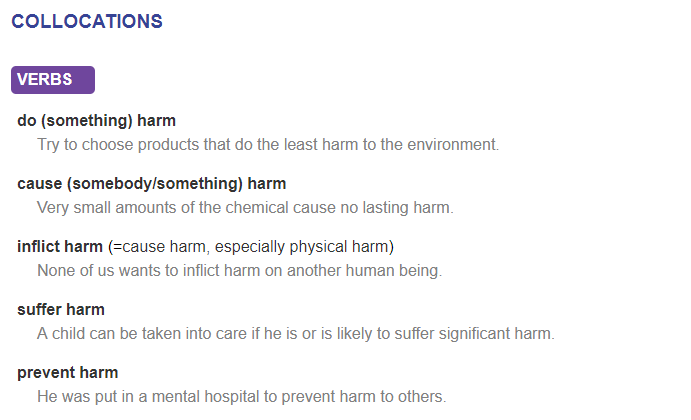 词典还有两个实用的拓展功能:搭配(COLLOCATIONS)以及同义词(THESAURUS)。很多同学在写作时经常不知道单词应该如何搭配才准确,朗文词典给出的搭配功能可以比较好地解决这个问题。举个例子,对于单词harm,词典会列出它的各种常见搭配:do/cause/inflict harm, lasting/permanent harm, do more harm than good…