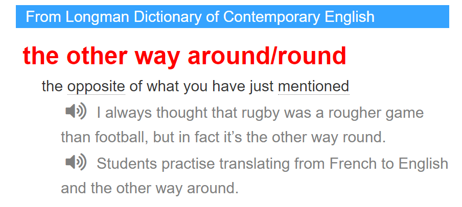 the other way around/round是一个固定搭配,意思是“相反地,倒过来”,比如:Art reflects life, or is it the other way around? 是艺术反映生活,还是相反?