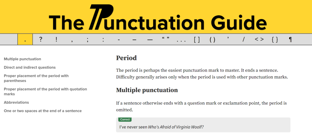 网站对常见英文标点符号进行了详细说明,同时还有大量例句可供参考,对标点符号用法有疑惑的同学推荐去看一看。