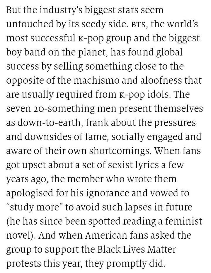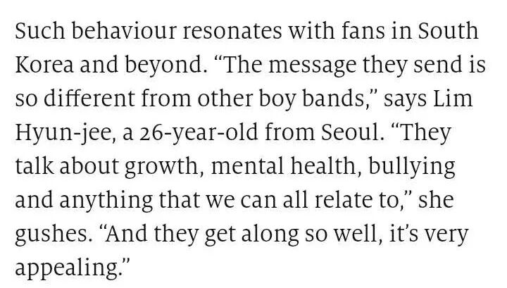 Such behaviour resonates with fans in South Korea and beyond. “The message they send is so different from other boy bands,” says Lim Hyun-jee, a 26-year-old from Seoul.