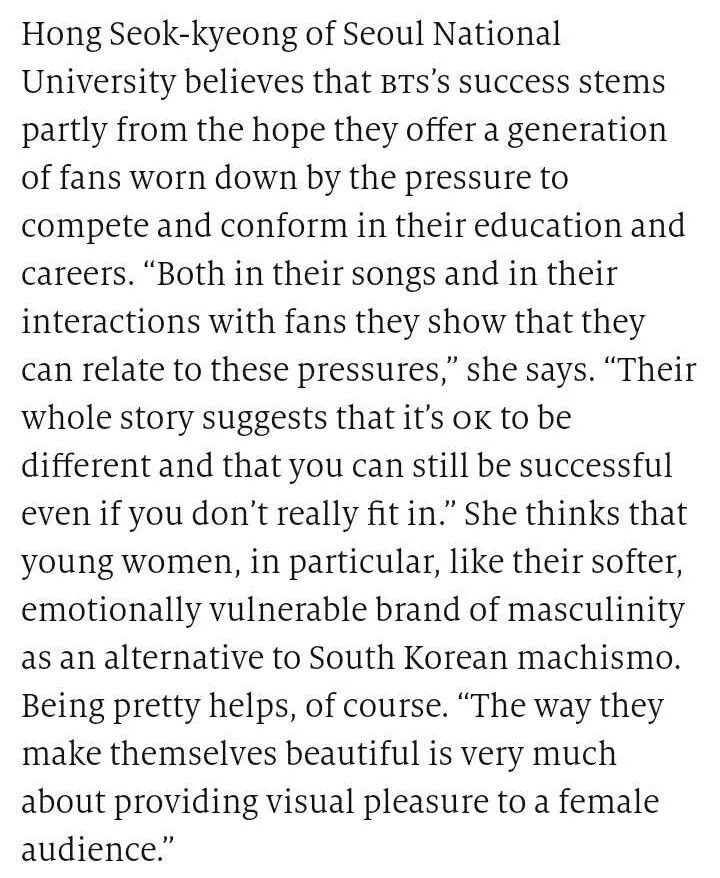 首尔国立大学的洪硕京认为,防弹少年团之所以能够成功,部分原因是他们给了粉丝希望,这一代粉丝心力交瘁,因为他们在学业和职业上要不断竞争,也要从众。