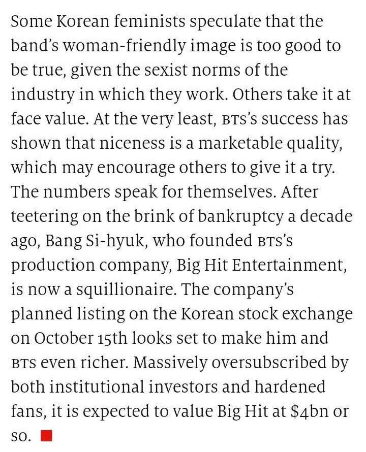 The company’s planned listing on the Korean stock exchange on October 15th looks set to make him and BTS even richer. Massively oversubscribed by both institutional investors and hardened fans, it is expected to value Big Hit at $4bn or so.