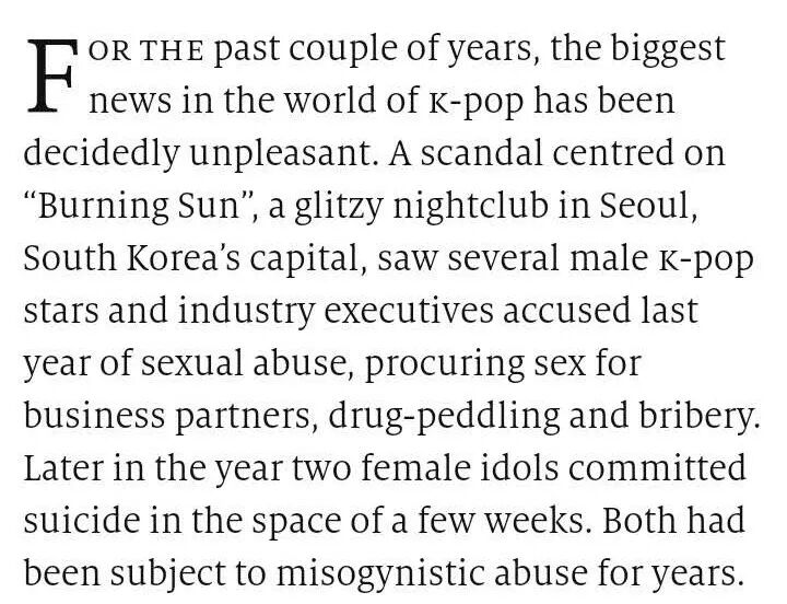 A scandal centred on “Burning Sun”, a glitzy nightclub in Seoul, South Korea’s capital, saw several male k-pop stars and industry executives accused last year of sexual abuse, procuring sex for business partners, drug-peddling and bribery.