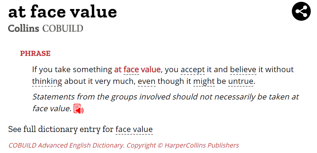 Take something at face value是一个固定搭配,含义是“仅凭表象就对……信以为真”。