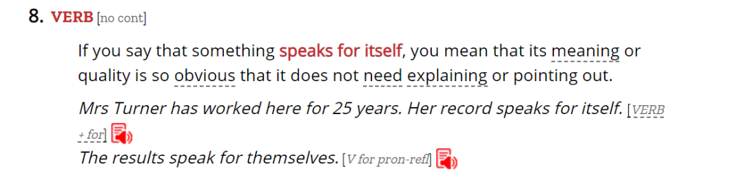 XX speaks for itself/XX speak for themselves意思是“XX是不言自明的,XX是有目共睹的”,比如要表达“学校的优秀成绩是有目共睹的”,可以说:The school's excellent record speaks for itself.