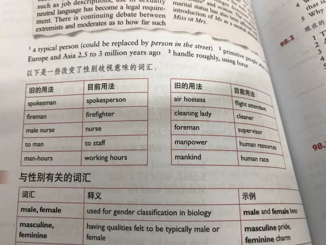 《剑桥英语词汇》除了对主题词汇进行讲解之外,还介绍了不少词汇在语用上的注意事项。举个例子,由于近年来平权运动的兴起,英语中一些可能会涉及到性别歧视的词汇目前正受到一些人的抵制,因此在使用时要多加注意。典型的词汇如spokesman/mankind/cleaning lady,这些单词都只偏向于某一方性别,显得不够中立,在使用时可以改为spokesperson/humankind/cleaner