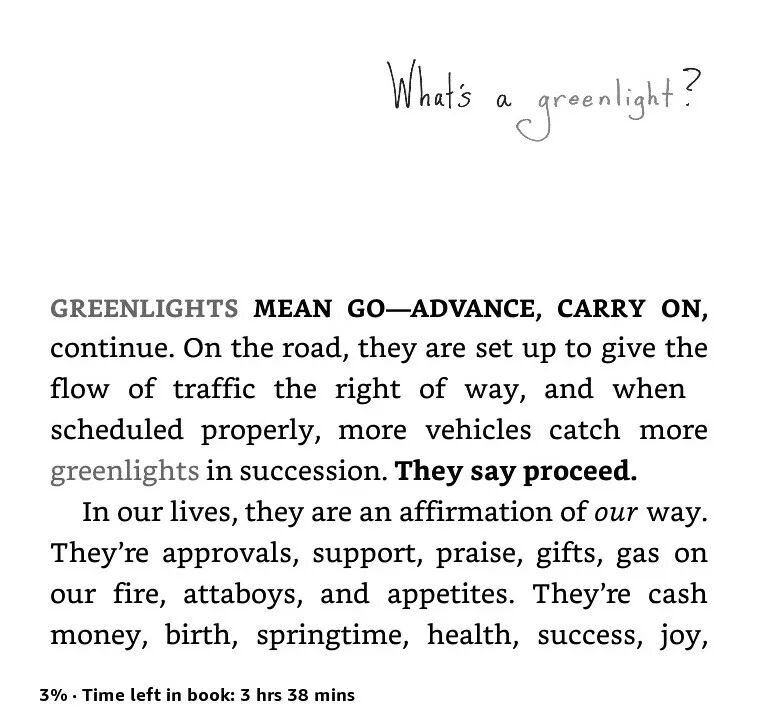 这本书的名字为什么叫Greenlights(绿灯)呢?作者解释说如果我们在马路上遇到绿灯,说明前方一切顺利,可以畅通无阻,绿灯也因此代表成功、快乐、金钱和名声等这些人们渴求的东西。与绿灯相对应的则是红灯和黄灯,它们代表挫折、失败、痛苦等阻止我们实现目标的事物。作者认为我们要弄清楚哪些是生命中的红灯和黄灯,并想办法避开它们。同时我们还要做好充足的规划和准备,以便能够抓住各种绿灯。