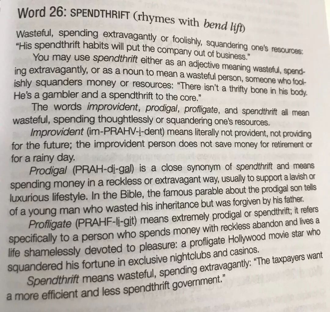 每个等级都有50个重点学习的单词,但读完全书你能学到的单词并不止500个,因为作者在对每个单词进行解释时还加入了大量的同义词、反义词以及拓展词。举个例子,作者在解释spendthrift时还顺带解释了其近义词improvident, prodigal, profligate