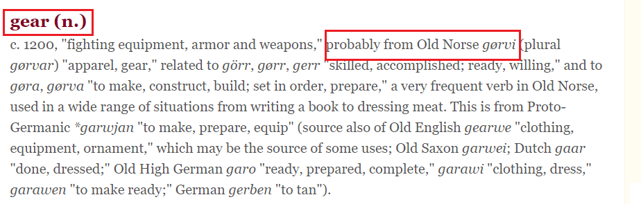 哦,漏了标题中的单词了:gear [ɡɪə(r)] n. 齿轮;装置,工具;传动装置;排挡 vi. 适合;搭上齿轮;开始工作 vt. 开动;搭上齿轮;使……适合;使……准备好。哈哈,为啥这个gear不变成year呢?太简单了,因为gear这个单词不是英语本族单词,所以它并没有发生今天说的g>y音变,见词源资料如下: