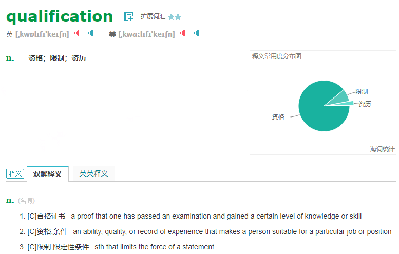 除了资格证明,qualification还能代表某人具备某个活动或工作的能力、特质和经历。比如招聘启事要求拥有xx证书或工作经验,只有达标了才可以说具备胜任这份工作的qualification。