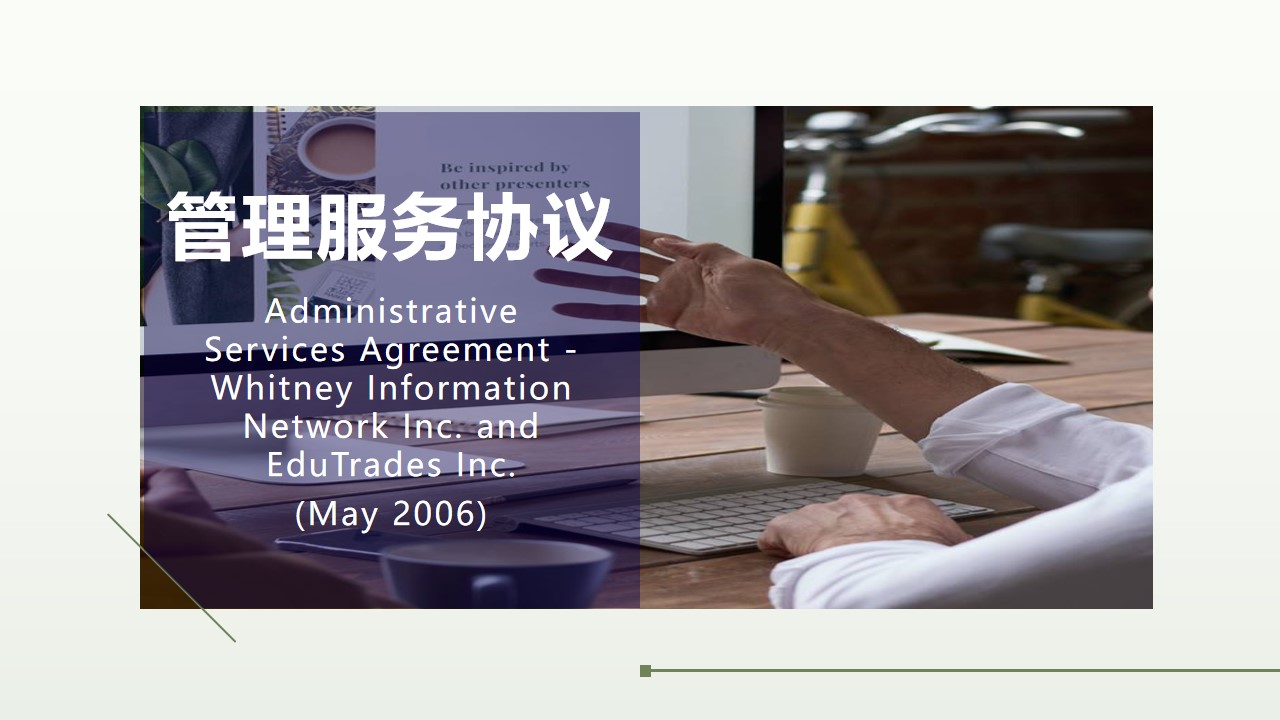 THIS ADMINISTRATIVE SERVICES AGREEMENT ("Agreement") is made and entered into this 1st day of August, 2005, ("Effective Date"), between Whitney Information Network, Inc. ("Whitney"), a corporation duly organized and incorporated in the State of Colorado, and EduTrades, Inc. ("EduTrades"), a corporation duly organized and incorporated in the State of Nevada.