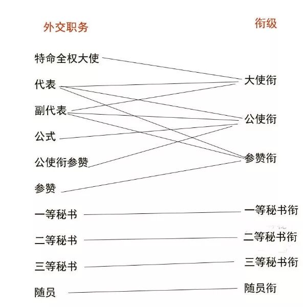 外交职务:分为特命全权大使、代表、副代表、公使、公使衔参赞、参赞、一等秘书、二等秘书、三等秘书、随员。