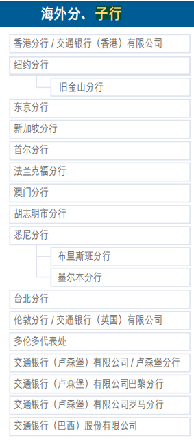 乍一看,可能会将这里的“子行”翻译为“支行”,sub-branch,但其实一经搜索,即可发现,这里的“子行”并非国内的“支行”。国内的支行通常被称为“XX银行XX支行”,而海外“子行”则多以公司的形式存在,常被称为XX有限公司,如以下为交通银行的海外分行及子行: