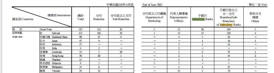 但若在某些文件中,若海外分行与海外分(子)行同时出现时,也可将其译为“subsidiary bank”,以示区分。这一译法有在台湾金融监督管理委员会编印的金融资料中出现过。如下图所示: